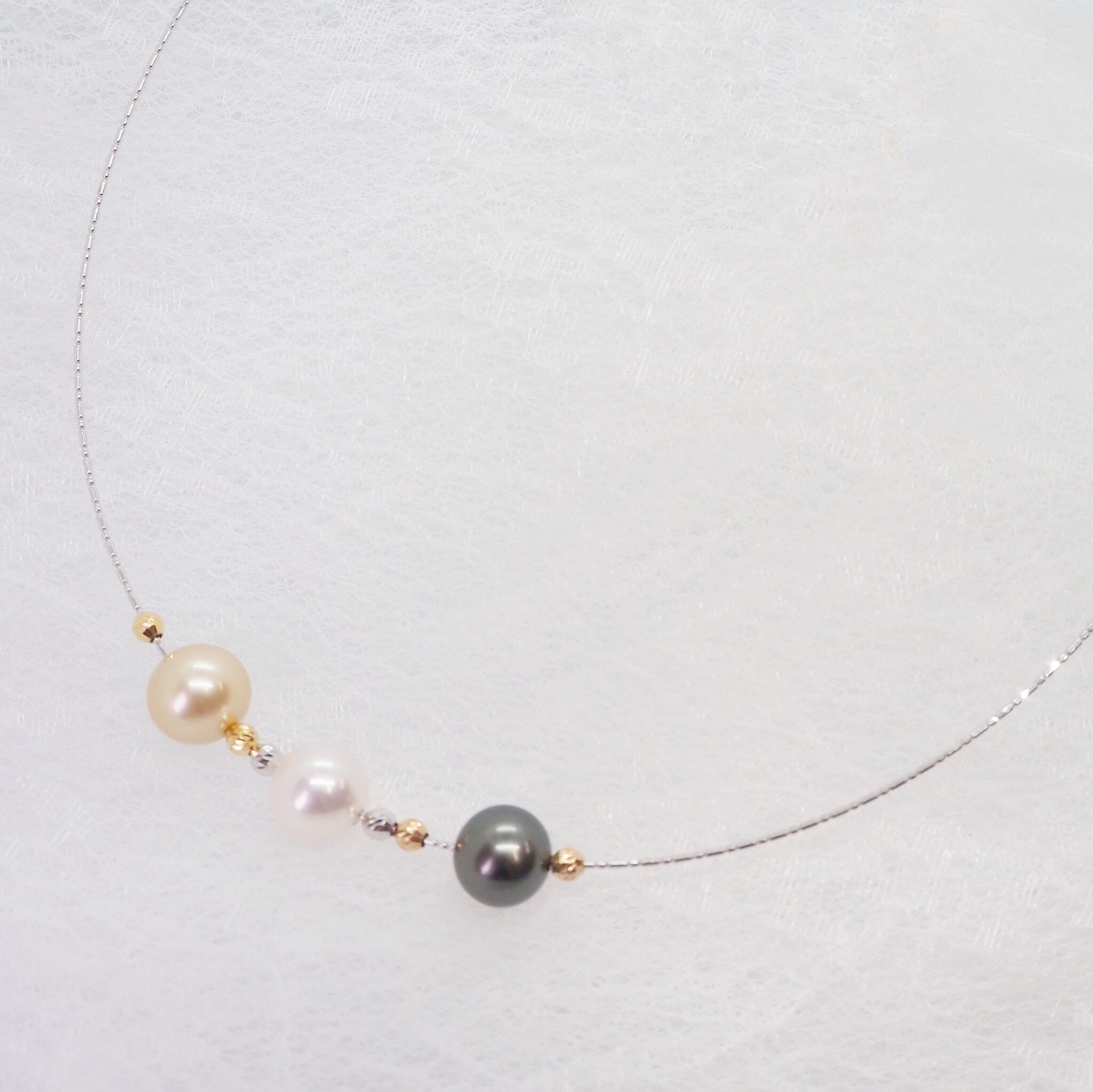 カスタム可能な3粒のアコヤ真珠が美しく輝くオメガネックレス